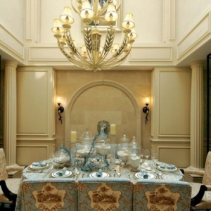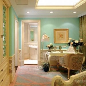 本设计中,将不同的色彩完美组合,打造了别样趣味的欧式风格室内空间,家具的选择上端庄稳重;墙面壁纸的选择上甜美温和;装饰品的摆放合理到位,装饰元素上各类雕花的出现,更加增强了整个空间的豪华与典雅。