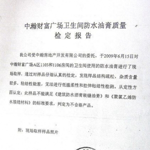 防水油膏不合格检定报告 新房交付延期、渗水、发霉 工程挂靠违规经营埋下质量隐患 湘潭开发商延期交房遭50余名业主起诉 2月4日,湘潭中瀚财富广场20多名业主因为购房纠纷联名维权。随后记者对该楼盘的开发商湘潭中瀚房地产开发有限公司(下称“中瀚地产”)相关负责人刘斌采访时,则被告知“因为楼盘的签约装修公司长沙卓凡装饰公司采取挂靠经营不但使工程延期交付,还使得装修质量无法得到保证,致使中瀚地产损失几百万不说还背负不诚信的骂名,真是打掉牙齿往肚子里吞”。而这一说法被长沙卓凡装修公司负责人陈铭否认。 湘潭市建设局建筑办公室副主任、清欠办主任李三民表示,工程挂靠已成为整个湖南乃至全国工程行业的一个潜规则。由于前来挂靠的工程队伍存在资质不够,技术、人员素质参差不齐等诸多因素,往往使得工程过程中潜在各种各样的危险。 本报向每一位消费者征集揭开行业潜规则内幕的线索,维权热线:0731-84839110。 政府部门认定质量不合格 业主毛女士曾在湘潭当过中学教师,后来去深圳发展。2007为中瀚财富广场“买一层送一层”的广告吸引,她买下了1540房并于2007年10月份签了合同。 毛女士说,由于2008年初的冰灾,开发方告知,房子必须延迟到2009年3月才能交付。可等到推迟的时间,毛女士拿到手的只是一个毛坯房。开发商表示,要她自己去和装修公司签订《装修质量责任合同》,自己对房子进行装修。毛女士说,当初看样板房听开发方介绍时,房子面积为112平方米、层高为5.2米,可实际拿到的房子如何呢?“1540房靠近拐角,一层被当做花园设计,根本不能正常使用;二层则只有30多个平方米,层高仅2.5米”。 老胡也是业主之一。老胡称看到房子后有三点理由使得他有了退房的念想,“延期不说,地板凸起、墙壁发霉、卫生间天花板滴水不断,最让我无法接受的是甚至连我原来的装修构想都被无故改变。”