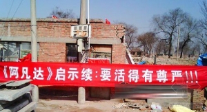 拆迁户挂阿凡达横幅讨说法:要活得有尊严