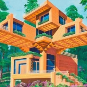 一栋河畔的小型家庭旅馆:朝鲜建筑师称之为“鸟巢”,并表示这所旅馆的很多结构与古朝鲜建筑风格类似。而对于这栋建筑的建造基础,设计师有效地利用了周围环境中的林木。