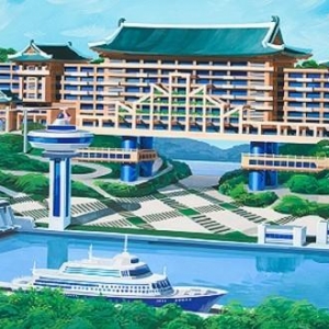 样图中的部分设计远远脱离了现实基础,相比已建成的建筑有了巨大的飞跃,但建筑师们相信这在未来是可能实现的。上面这张照片展示的是建在南浦港口西海拦水坝上的一家酒店和一艘豪华游轮,而目前该地区并没有完备的住宿设施。