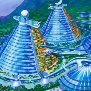 未来世界的锥形建筑群:这看起来像是一座座树立在乡村地区由钢铁和玻璃架构的山峰。