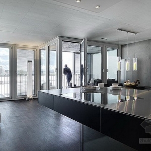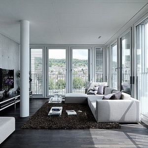 瑞士灰色复式公寓室内设计,我喜欢建筑结构中的巨大落地窗,尤其是那间独立出来的茶室。深色木制地面与水泥墙的搭配使整个空间显得大气稳重,主卧室中半开放的浴室以及设置在楼梯上放的厨房操作台是整个设计中最精彩的部分。