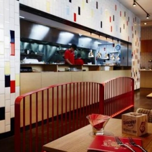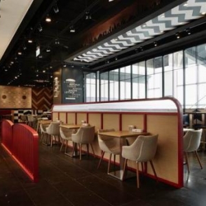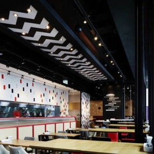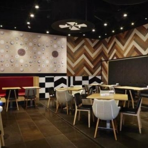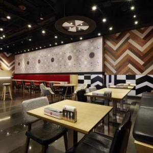 今天的推出的由禧德设计一改美式餐厅常用的西部牛仔风格,以“Open Kitchen”的概念尝试于百货公司中打造前卫欢乐的美式餐厅氛围。首先以连续的黑白图腾改造原有的铁件装潢,堆衬在铁件背后的是缤纷的斜口砖与明快的用餐氛围。