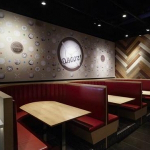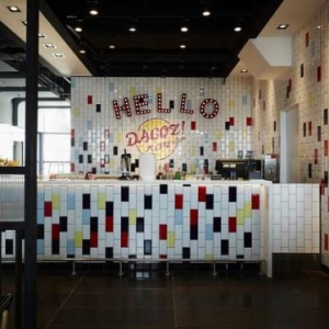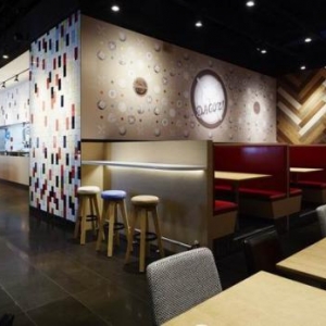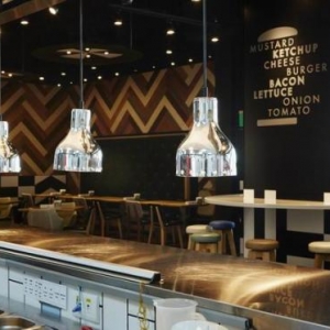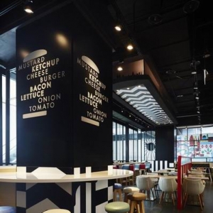吧台区块借用马戏团的欢乐印象,以灯泡串出活泼的HELLO字样作为收银及饮料吧台的迎宾印象;用餐区的主墙面,以平面设计师手绘汉堡内馅拼绘输出图面铺陈,创造亲民的企业形象。