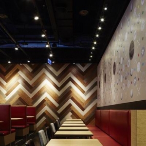 摘要: 摘要: 首先以连续的黑白图腾改造原有的铁件装潢,堆衬在铁件背后的是缤纷的斜口砖与明快的用餐氛围;吧台区块借用马戏团的欢乐印象,以灯泡串出活泼的HELLO字样作为收银及饮料吧台的迎宾印象。 ...