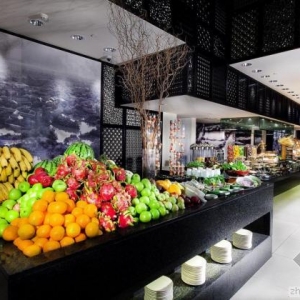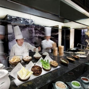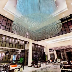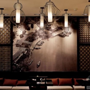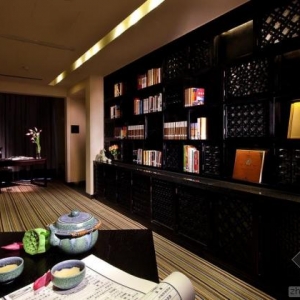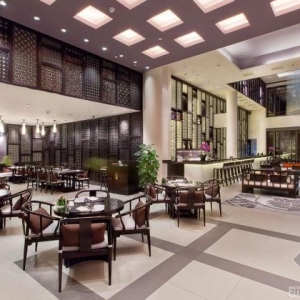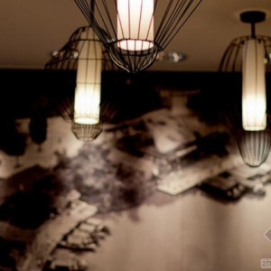 进入大堂则完全是现代的设计,但是带有东方特色的中式家具、由灯笼而得来灵感的弧状吊灯、大堂内芦亭餐厅中的水墨壁画等等,无处不体现着江南风情。而大厅中央由无数水晶珠串联而下的巨大圆幕,大概是设计师收到江南朦胧烟雨的启发而来吧。