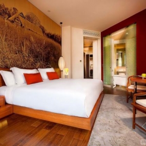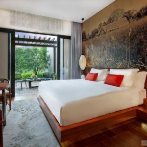 酒店内共有59间精致别墅,中式风情在客房中的体现似乎更为浓重。床头灯笼形的吊灯倍添温馨,墙面上的巨幅装饰画一律选用复古的褐色基调,与房间内木质家具和地板呼应,落地窗外或可欣赏天边夕阳,或可对着私家庭院,让你静享温馨宁静的时刻。