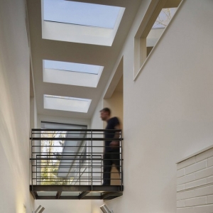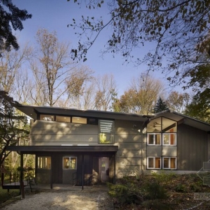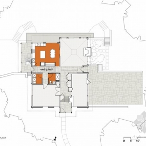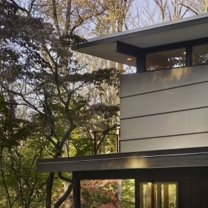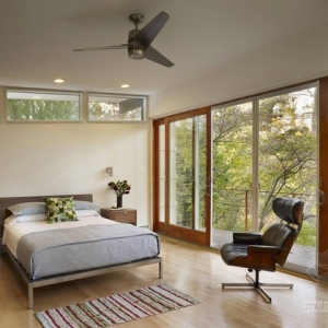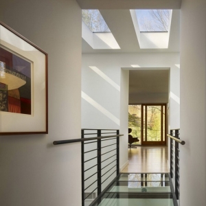 所 在 地:美国 宾夕法尼亚州 拉法叶山面积:350图片提供:Barry Halkin Photography该别墅始建于中世纪,之前经过翻新,周围自然环境优美,是一片茂密的森林。别墅二层的房间深入到树冠中,带有一个客厅,一个门厅,厨房和浴室,与周围环境融为一体。设计师将原先狭小的门厅改建为带有天窗的双层门厅,二层还有玻璃走走廊。通过门厅可以直达厨房,餐厅和客厅。从窗户里可以尽情欣赏周围美景。二层还有主卧和配套浴室,主卧里也装有天窗,与悬臂式阳台相连,之间有落地玻璃门隔开。卧室与别墅的其他房间之间是钢化玻璃制成的走廊。