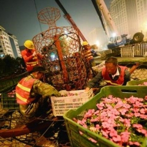 长安街迎国庆立体花坛 前两日,长安街沿线的10处国庆立体花坛开始搭建。《法制晚报》记者从市园林局现场工作人员处获悉,昼夜施工使布置进展比预期要快,一半花坛昨日已大面完工,预计花坛将提前一天全部竣工。 昨日上午,记者在东单路口看到,花木公司的工人们正在东单东北角的“歌唱祖国”花坛和西南角的“诚信公平”花坛脚手架上插花,其中的钢琴和天平花雕已经成型。这两处花坛制作过程中首次引入了3D打印模型。 记者看到,由于立体花坛和脚手架都在绿化带里面,对过往行人几乎没有影响。 长安街花坛布置采取了立体花坛、容器花卉和地面种植等多种形式;应用上既有成熟的卡盆缀花工艺,又有开花穴盘苗栽植工艺,同时深化细节处理,融合雕塑、插花花艺以及柳条编织等手工艺。 同时花坛将设置夜景照明,广泛采用LED灯具,不仅环保节能,而且颜色逼真、亮度高、效果好。 此外,由于今年要兼顾APEC会议环境保障需求,APEC会议期间,长安街沿线将更换两处APEC主题花坛,其他花坛花卉将采取强化管护措施、部分花卉更换措施,将景观效果延续到APEC会议闭幕后。