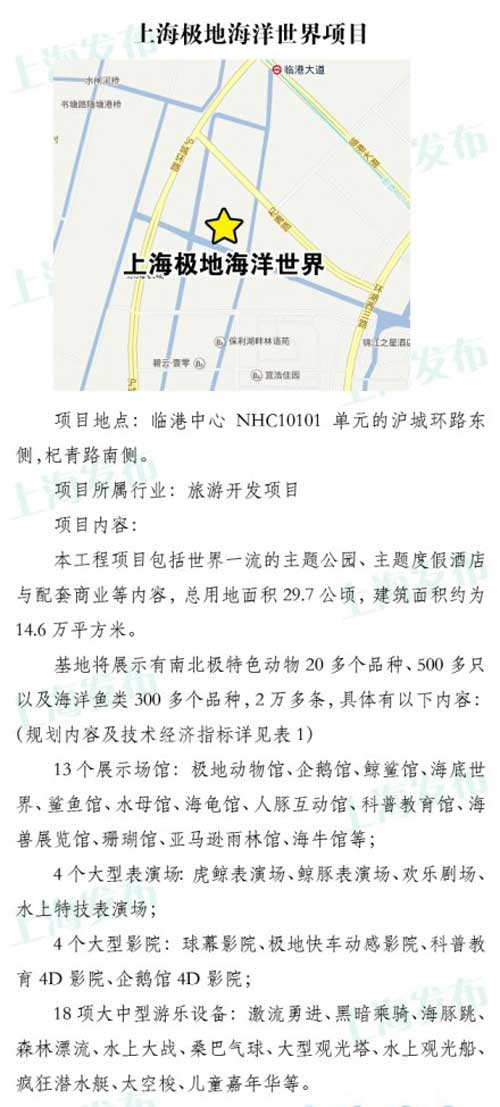 摘要: 9月24日,据上海市政府新闻办公室官方微博消息,计划建于临港中心的上海极地海洋世界项目正在环评公示,项目包括世界一流的主题公园、主题度假酒店与配套商业等内容,具体有13个展示场馆、4个大型表演场、4个大型影 ...