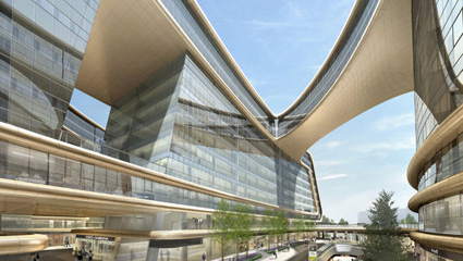 凌空sohu 上海虹桥新地标凌空sohu落成,设计前卫造型奇特。11月3日,在虹桥金钟路现场,建筑整体已经完工,零星有施工人员还在进行紧张的收尾工作。 建筑主体充满了流线型的设计元素,半空中的连廊也是极富动感的曲线造型,在偌大的基地内漫步,建筑表面几乎找不出一根直线,连转角落地玻璃都被设计成变换的双曲面。整个建筑前卫的设计造型和空间穿插给人感觉仿佛穿越到了未来。 凌空SOHO由世界著名建筑设计师扎哈·哈迪德(Zaha Hadid)担纲总设计,是扎哈在上海的首个建筑作品。项目紧邻虹桥交通枢纽,总建筑面积约35万平方米,集办公、商业于一体,将成为进入上海的门户性新地标。设计灵感来源于虹桥交通枢纽这一地理位置,凌空SOHO打破传统的建筑语言,拥有超前卫的流线型外观和丰富的空间变化,充分展现出“速度与激情”的设计理念。在虹桥机场周边建筑限高40米的情况下,建筑形体强调了水平的流动与连结。凌空SOHO由四栋建筑组成,建筑端头的设计让人联想到高铁车头,极具动感。最高落差约40米的空中连桥,俯瞰或仰望,如置身大自然中的峡谷,震撼非凡。