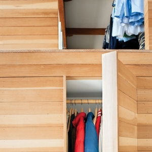 设 计 师:Lynda,Peter Benoit夫妇所 在 地:美国 加利福尼亚州 埃默里维尔面积:102平米这栋住宅之前是一间蒸汽机工厂,设计师将其改建为一间充满创意,精心布局,充满生机的美观现代住宅设计。现代住宅室内设计的中心是一个16×17××10英尺的箱子,箱子里是一间卧室,整个箱子是花旗松木板木制的。外表形成架子,使室内有充足的储藏空间。箱子旁边还有通向箱子上方储藏室的楼梯。箱子内卧室墙壁上还有衣柜和一系列垂直空间,住宅带有落地窗,使室内光线充足。虽然现代住宅室内面积不大,但巧妙的设计仍然使这里方便舒适。