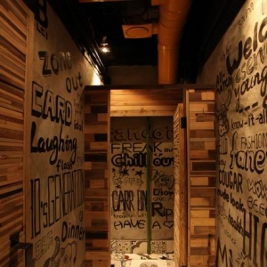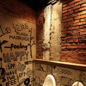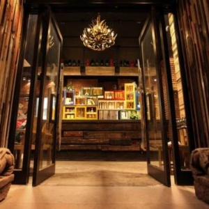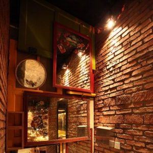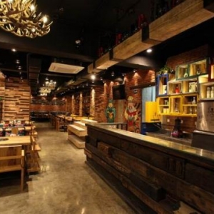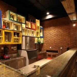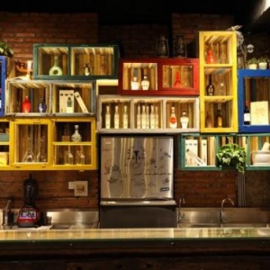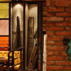 陈旧的老枕木提升了吧台的气质,感觉沉稳大气而又富有韵味。搭配老式窗户做成的绚丽酒柜,实用的同时,给人带来神秘幸福。门斗处用了上千条从老式门窗上取下来的木条,千家门窗,千家颜色。在满目原木中带来彩虹般的绚丽,满满的眩晕了视线。粗犷的架构,让人有种时光穿梭的错觉。红砖原色的墙面和水泥原色的地面,表现出最原始的状态。即质朴又清新舒爽!