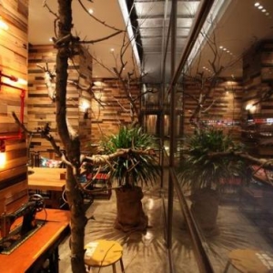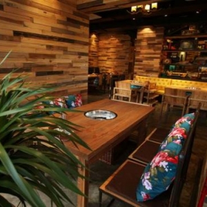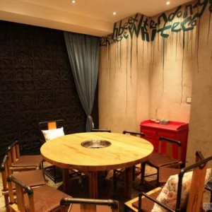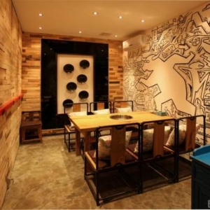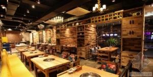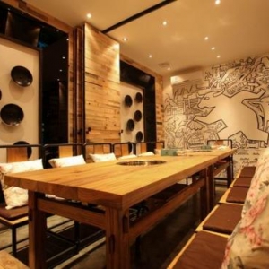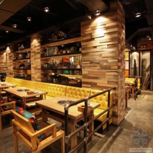 韵味十足!大连“浓重色彩”蓉客火锅店,温暖的灯光着色在原始材料构筑的墙面上,温馨,怡然。设计师希望就餐的顾客可以享受到美味的同时又能够感受到物质本身的回声。不同的原木构成了店面的大部分空间,新旧木材错落构成墙面的主体装饰。旧船木的大门把手,给人深远绵长的回味。