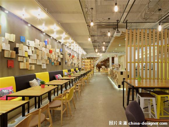 图:言几又书店 “到处都是书”是言几又书店的一个主要的品牌目标,同时也是这个项目的设计核心。书籍引领了整个空间的主导地位。书店设计的主要特色在于一个旋转楼梯,这个楼梯被当成书店的正面。主要由书本构成,书籍形成了视觉上的楼梯扶手,极大地增强了空间之间的互动,清晰地凸显出客户核心商业的成分。 咖啡区内一个十多米长的“书墙”是书店设计的另一主要特色。展现出富有鲜活生活方式的文学气息,传递出品牌的标语和商标。通过使用简单的材料组合,如木头,砖头及混凝土地板平台营造出令客户放松的环境氛围,我们坚持在书本区域中展现出简单这一特点。喇叭造型的中心吊灯,结合了艺术和功能性,在整体简洁的空间内,传递出一种现代的新潮风格。 台湾格蕾朵烘培坊