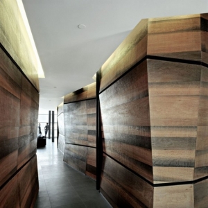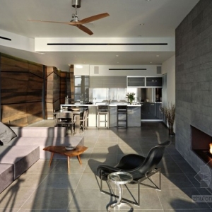 所 在 地:美国 纽约 面积:297平米 该公寓位于一栋建筑的第八层,室内布局开阔,整体更倾向于是一系列重叠的空间组成的,周围各个方向都有窗户,为住户提供了良好的视野,同时增强了室内外联系。公寓东西方向有露台,其中一个是从主卧向外延伸的,另一个则与客厅相连。住户在与客厅相连的露台上能俯瞰哈德逊河景色,露台与室内空间之间有玻璃幕墙相连。别墅西边的双层玻璃不经能为住户提供开阔的视野,还是很好的绝热结构,同时为室内提供充足的光照和热能。公寓内还安装了智能控制系统,能控制灯光,吊扇,百叶窗等结构。室内装饰风格舒适轻松,采用了大量自然元素,气氛随意温馨。公寓整体结构由黑色金属框架和可循环沉木板还有橡木组成,主要支撑结构将私人空间与周边的有机结构分开,有利于公寓内光线和空气的流动。这个支撑结构还支撑着垂吊式天花板。室内装有嵌入式加湿器和空气净化系统,能提供冷暖气和新鲜空气。公寓的音乐室,客用浴室,主卧等结构由中轴向外延伸。