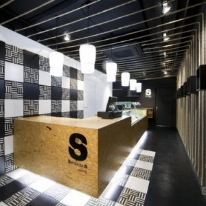 所 在 地:西班牙 萨瓦德尔建筑师:Denys & von Arend室内设计师:Daniel Pérez, Felipe Araujo面积:119 平米这间餐厅是由一间地下车库改建而成的,整个品牌的理念就是满足两类人群的需要,即向顾客提供高级美食,又提供平价菜品。店铺正中是入口处,服务台色调为黑白相间,有条形瓷砖图案装饰。店铺里还有一个陈列碗碟的玻璃冷柜,冷柜里的餐具被像珠宝一样陈列着,屋顶上的五盏吊灯有厨师帽一样的灯罩,为餐厅增添了温馨感。墙壁和天花板都是黑色的,装饰有北非茅草,墙壁上还有瓶架。店铺里的图案和颜色无不体现了品牌形象。