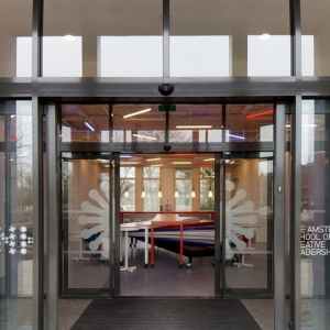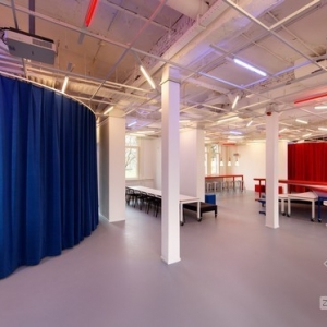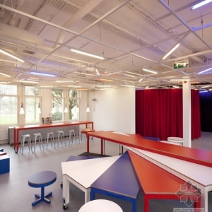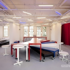 所 在 地:荷兰 阿姆斯特丹建筑面积:300平方米这个室内设计受到Studio Lava工作室为THNK打造的LOGO样式的启发,Concrete建筑事务所设计师提供的是一系列多功能的家具装置,它们为商业学校定义了新的个性。这个学校的指导思想是协作,而不是单独行动,设计师将这一理念带入设计,打造出I 字形的椅子,桌子,凳子和吧台。这些家具元素互相堆叠,红色,蓝色,白色,黑色异彩纷呈,它们聚集在室内中心,形成THNK的LOGO。白天学生们和老师们可以随意使用这些家具,只要在结束时放归原位即可,家具的高度不同,适合不同的人使用。