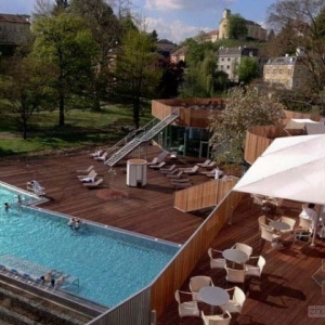该温泉理疗中心坐落在奥地利Gleichenber市一个受保护的公园内,设计来自于Jensen & Skodvin Arkitektkontor。这家温泉理疗中心大约包括50个不同的药物治疗房间,并且还提供了四星级温泉酒店,其中包括提供给客人的几个不同的餐馆,咖啡馆以及一个可供治疗区域患者和其他客人公开使用的温泉浴。