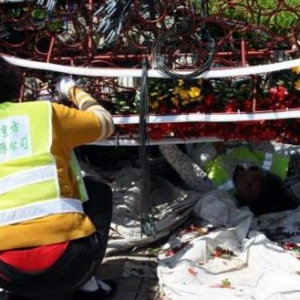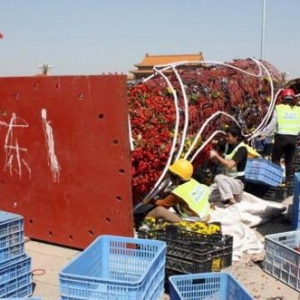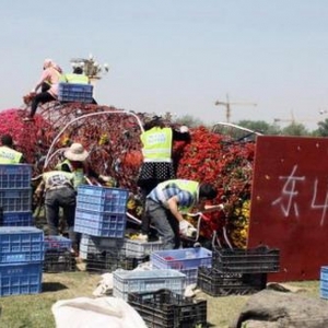 天安门广场东侧工人正在布置花柱 |