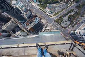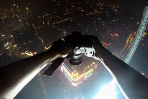 2015年3月29日,上海,来自慕尼黑的18岁的Andrej Ciesieksi在无安全设备保护的情况下,白天两次站在333米高的世贸国际广场顶部,俯瞰上海景色。