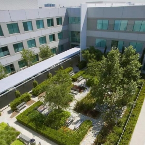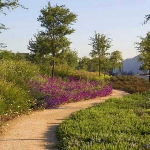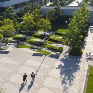 丰田汽车公司南部厂区的景观设计主庭院内几何形的景观和铺装形式营造了一个小型室外生态区。喷砂混凝土和预铸混凝土铺路机的使用营造了集会空间的纹理和颜色,这个引人注目的空间可以容纳全体员工。这个穿插着步行道的庭院充满了茂盛的海岸栎和鸡子木。葡萄藤墙营造了有趣的光影和纹理。耐旱植物提供了独一无二的地中海氛围。主题花园里的小型座椅使人完全脱离了办公环境,置身大自然。日式花园彰显了丰田的起源。一条风化花岗岩散步道效仿了森林牧场。回收的碎混凝土用作装饰性铺装体现了项目的可持续理念。几何纹理的入口广场增添了色彩和质感。