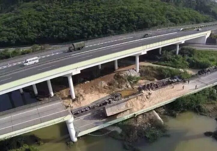 粤赣高速河源段匝道突然断裂 多车坠落已致1死4伤 6月19日凌晨3时许,粤赣高速广州往河源方向城南出口匝道突然断裂坍塌,在匝道行驶的4辆货车坠落,目前事故已造成1死4伤,当地仍在进行紧张救援,具体伤亡数字仍在统计。目前粤赣高速城南往梅州、深圳方向入口以及广州往江西出口都已封闭,河源交警城南高速一大队3时40分接到报警后,消防、公安等官兵连夜赶到现场救援。图为粤赣高速广州往河源方向城南出口匝道坍塌现场。 当天早上8时许,驱车赶到了塌方现场,看到4辆大型的运载瓷土矿的挂车均侧翻在出口左边,车头都被掩埋了,损毁严重。其中有1辆河源牌,3辆江西牌。记者在现场看到,该断裂的匝道横跨一条约5米宽的溪流,河段长约50米,水位不高,附近搭建了不少工棚。断裂长度约70米,形成一个斜坡,有钢筋裸露出来,桥墩被压在下面。断裂处距离城南出口约200米。目前,一辆大型的吊机已到现场,但无法抵达坍塌处,救援部门正在商量更好的救援方案。事故原因仍在调查中。 |