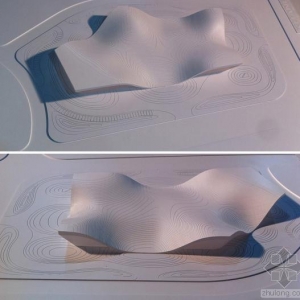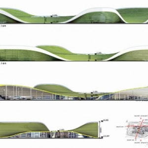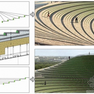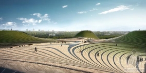 鄂尔多斯展览广场整个建筑的室内外均可以行走。部分使用了石材和草坪,让屋顶成为了自然通道,是广场空间的延伸。每五级楼梯就设置一个窗口带,让自然光线流入室内。该项目目前正在准备动工。