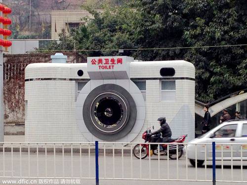 2015年8月6日,重庆石桥铺数码城路边,一座“照相机”造型的公厕另路人目瞪口呆。据悉,“照相机”公厕是以“照相机”外形来修建的公共卫生间,长6米,高3米,厚1.5米,可同时容纳10人如厕,成为一道创意城市风景线。