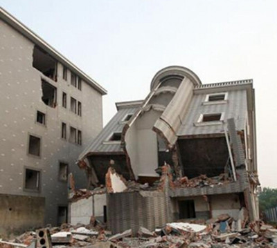 拆迁中的“楼坚强” 2015年5月8日,杭州城东一城中村拆迁工地,一栋三层楼一楼几乎“连根”断掉,整栋楼倾倒,二三层楼依然完好,网友戏称该楼为“楼坚强”。 3、空手抓破墙