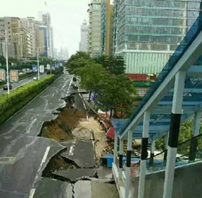 路面坍塌 2015年7月26日凌晨,佛山CBD地段季华五路万科广场工地一侧辅道突然发生大面积塌陷,附近两辆行驶中的公交车急刹掉头。事故初步调查原因可能是工地南侧基坑防护坍塌所致,事发前一天夜里佛山下过暴雨。 |