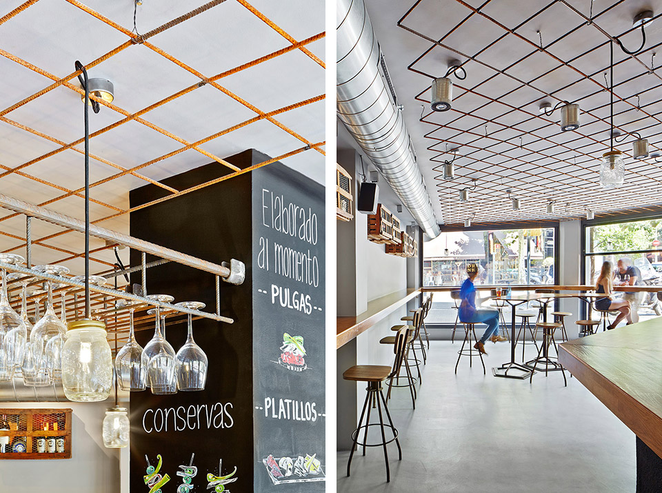 来自Pepe Gascón: 设计师设计西班牙巴塞罗那Tapas Bar 4 Latas酒吧的初衷在于让人们能够自由自在享受美食与美酒:不用限定在一个桌子上,而可以像自由的社交场所或者PARTY那样走来走去。