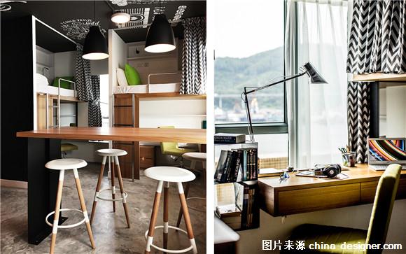 每个公寓室内实用面积只有27㎡,设计师祛除了原本隔开两个房间中心的墙壁,取而代之的是一张共享的高桌,它不仅具有就餐、阅读、学习的功能,更是为室友们提供了一个社交互动的平台。合理的床位安排,不仅利用了每一寸的空间,飘窗,墙壁内,甚至是屋顶,都被赋予了实用的功能空间,同时又仍然能保持一种私密的感觉。公寓的4个床位被设计成了半悬空式,床位下面留出的空间设置了一个较为宽敞的书桌。房间里的四个床位都设计全钢梯子、 遮光窗帘、 便利的墙上插座和阅读灯,拉上窗帘,你就拥有了一个不被打扰的私人空间。在这个空间里还巧妙地纳入挂衣杆、可伸缩的架子、可上锁的抽屉、独立存放行李箱的空间、以及镶入式书桌和多个USB 插口,十分便利,你可以睡在床上便能解决掉工作、学习的大部分需求。