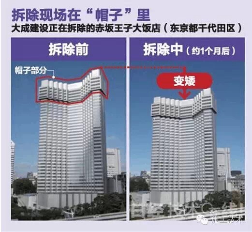 如果采用大林组的方法,在拆除顶部后,需要将隔音板下移,而大成建设采用的方法是利用立柱状的液压千斤顶使帽子部分下落。就是在立柱的部位设置立柱状的液压千斤顶,在拆除掉地面和承重梁后,最后利用液压千斤顶使帽子部分下落。看上去就像帽子一点点接近地面。