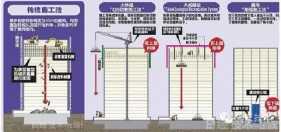 超高层建筑的拆除方法是由各公司各自开发,名称各异,但基本顺序大同小异。都是在顶层把建筑物切割成块状,用起重机把拆除废料吊到地面。差别仅在于选择的“起重机等设备”和“养护方法”,成本也因此而不同。
