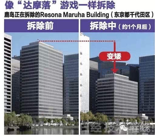 鹿岛开发的拆除方法与其他公司大相径庭,其他方法都是从建筑的顶部开始拆除,而鹿岛的方法则是从底层开始拆除,其正式名称是“Cut&Down(削低)施工法”,大家一般称其为“达摩落施工法”。使建筑物不知不觉消失这一点与大成的方法相近。