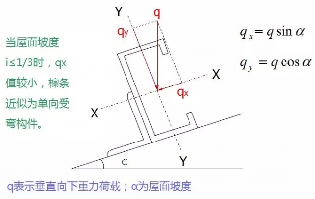 ★ 檩条的内力分析 ● 设置在刚架斜梁上的檩条在垂直于地面的均布荷载作用下,沿截面两个形心主轴方向都有弯矩作用,属于双向受弯构件(与一般受弯构件不同)。 ● 在进行内力分析时,首先要把均布荷载分解为沿截面形心主轴方向的荷载分量qx 、qy。