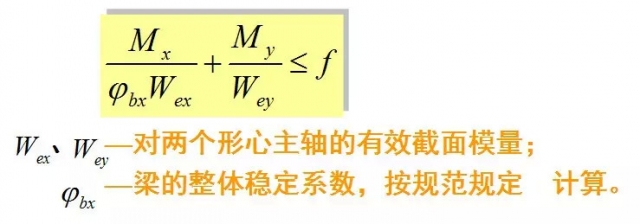 ★ 整体稳定计算 当屋面不能阻止檩条的侧向失稳和扭转时(如采用扣合式屋面板时),应按稳定公式验算截面: