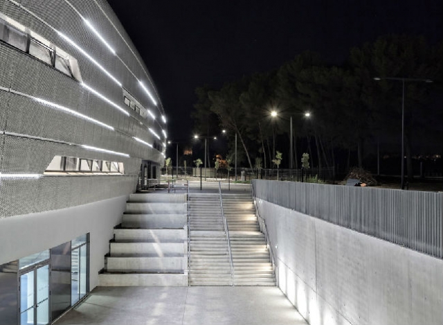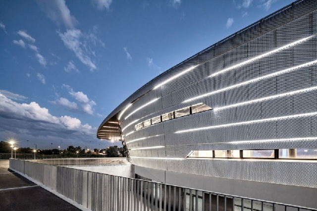 水平延展的金属板形成了建筑立面。金属板中间的条纹为立面的主要组织特点并形成了延伸到屋顶的柔和而鲜明的过渡结构。夜晚,立面上的带状玻璃窗投射出一缕缕明亮的光线,让体育场散发出无限活力。
