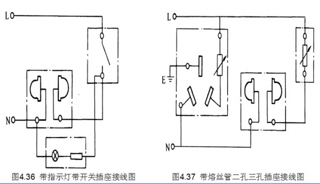 1插座安装安装要求 (1)当交流、直流或不同电压等级的插座安装在同一场所时,应有明显的区别,且必须选择不同结构、不同规格和不能互换的插座;配套的插头应按交流、直流或不同电压等级区别使用。 (2)插座接线应符合下列规定: ①单相两孔插座,面对插座的右孔或上孔与相线连接,左孔或下孔与零线连接;单相三孔插座,面对插座的右孔与相线连接,左孔与零线连接。 ②单相三孔、三相四孔及三相五孔插座的接地(PE)或接零(PEN)线接在上孔。插座的接地端子不与零线端子连接。同一场所的三相插座,接线的相序一致。 ③接地(PE)或接零(PEN)线在插座间不串联连接。 ④暗装的插座面板紧贴墙面,四周无缝隙,安装牢固,表面光滑整洁、无碎裂、划伤,装饰帽齐全。 (3)特殊情况下插座安装应符合下列规定: ①当接插有触电危险家用电器的电源时,采用能断开电源的带开关插座,开关断开相线。 ②潮湿场所采用密封型并带保护地线触头的保护型插座,安装高度不低于1.5m。 ③当不采用安全型插座时,托儿所、幼儿园及小学等儿童活动场所安装高度不小于1.8m。 ④车间及试(实)验室的插座安装高度距地面不小于0.3m;特殊场所暗装的插座不小于0.15m;同一室内插座安装高度一致。 ⑤地插座面板与地面齐平或紧贴地面,盖板固定牢固,密封良好。 2插座的安装 插座盒一般应在距室内地坪0.3m处埋设,特殊场所暗装的高度应不小于0.15m;且应符合前述规定。住宅内插座盒距地1.8m及以上时,可采用普通型插座。若使用安全插座时,安装高度可为0.3m。10㎡及以上的居室中,应在最易使用插座的两面墙上各设置一个插座位置;l0㎡以下的居室中,可仅设置一个插座位置;厨房、过厅可各设一个插座位置。 旅馆客房各种插座及床头控制板用接线盒,一般装在墙上,当隔音条件要求高且条件允许时,可安装在地面开关的垂直上方或拉线开关的垂直下方,不应设置插座。插座与开关的水平距离不宜小于250mm。插座盒不应设在水池、水槽(盆)及散热器的上方,更不能被挡在散热器的背后。住宅厨房内设置供排油烟机使用的插座盒应设在煤气台板的侧上方,距立管边缘600mm以上。在窗口两侧插座盒应设在与采暖立管相对应的窗口另一侧墙垛上。插座盒不应设在室内墙裙或踢脚板的上口线上,也不应设在室内最上皮瓷砖的上口线上。插座盒不宜设在宽度小于370mm的墙垛(或混凝土柱)上。墙垛或柱宽度为370mm时,插座应设在中心处。 暗装的插座应采用专用盒,专用盒的四周不应有空隙,且盖板应端正,并紧贴墙面。暗装插座与面板连成一体,接线柱上接好线后,将面板安装在插座盒上。当暗装插座芯与盖板为活装面板式时,应先接好线后,把插座芯安装在安装板上,最后安装插座盖板。 明装插座应安装在绝缘台上,接线完毕后把插座盖固定在插座底上。 插座接线时应面对插座操作。单相双孔插座在垂直排列时,上孔接相线,下孔接零线;水平排列时,右孔接相线,左孔接零线。插座接线时,单相三孔插座,上孔接保护接地(零)线,右孔接相线,左孔接工作零线。三相四孔插座,保护接地(零)线应在正上方,下孔从左侧起分别接在L1、L2、L3相线上。同样用途的三相插座,相序应排列一致。同一场所的三相插座,其接线的相位必须一致。接地(PE)或接零(PEN)线在插座间不串联连接。 带开关插座接线时,电源相线应与开关的接线柱连接,电源工作零线应与插座的接线柱相连接。带指示灯带开关插座接线图,如图4.36所示。带熔丝管二孔三孔插座接线图,如图4.37所示。