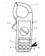 图钳形电流表 1-钳头2-钳头扳机3-保持开关4-旋转开关5-显示器6-绝缘测试附件接口7-公共地端8-电压电阻输入端9-手提带 5、高阻测量 ①将开关旋至"EXTERNALUNlT"20MΩ或2000MΩ挡。 ②显示值是不稳定的,处于游离状态。 ③测试附件3个插头插入钳形表的3个输入插孔。 ④钳形表开关,测试附件量程开关均置于2000MΩ位置。 ⑤测试附件输入端接被测电阻; ⑥测试附件电源置于"ON"位置,按下"PUSH"键,指示灯发亮,这时显示器显示出被测值,如果读数小于l9MΩ,钳形表测试附件的量程均选择20MΩ挡以提高准确度。