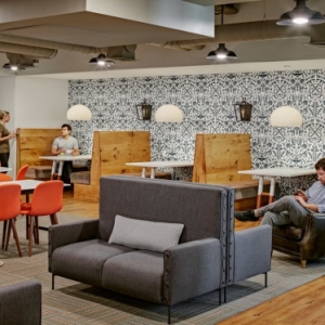 旅游点评网站Tripadvisor新总部以蓝色为主色,天空作为天花板图案,绿色植物饰满一整面墙,都有助于让人心情平和、愉快。工作之余坐在中央的大台阶上休息,不失为一个放松的好选择。 每层楼都以一个大洲命名,装潢也采用相应的特色风格。即使在工作区而非休闲区域,你也可以看到有鲜艳色彩或者造型别致的装饰或家具。