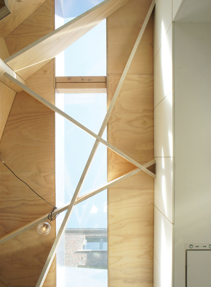 比利时的一对夫妇对家庭改造有很多意见,除了想要一个新的厨房和浴室,还想要更加通风开阔的空间。此外,丈夫 Hans 想在太阳光下读报纸,而妻子 Delphine 想要扩大花园面积。 当地的建筑事务所 Atelier Vens Vanbelle 并没有新建一个厨房,而是将原有的一个一层室内装修成秋天的风格。屋顶被不规则的木片层层分割,下面用原木柱子做支撑,仿佛用多颗大树搭建了一片树林。一部分天花板装上透明的玻璃,就像开了天窗,让阳光落下来。对应的马赛克地板用了黄色、橙色和棕色系,以模拟落叶的感觉。