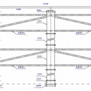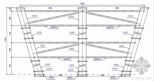 图2下横梁支架中钢管立柱立面(修改前)由于某种原因钢管立柱下部立柱间距减小3m,外面一排钢管由竖直变成倾斜,钢管立柱系统细部结构发生变化的有:立柱A2结构(含底部连接法兰)、立柱C2结构(含底部连接法兰)、连接系A1结构、连接系A2结构等(见图3)。