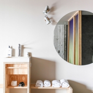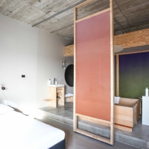 这家简陋的酒店每天人气爆棚她想制造出禅宗的感觉,加入了一个日式木质浴盆和可滑动的几块半透明的屏风,木结构的框架里面是打印出来的七彩渐变半透明的织布,“我设计的这几块滑动屏风,是半透明的印花布,类似于天空的感觉,它们共同创造出一个既开放又亲密的氛围。”