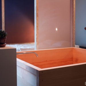 这家简陋的酒店每天人气爆棚将整个套房的睡眠与洗浴功能结合在一起,形成了一个休闲体验空间,那些半透明的屏风总会给你看到黎明或是黄昏的错觉。房间中央位置的传统日式浴盆选用了雪松木材质制作而成,其余家具则是经济实惠的胶合板制成。