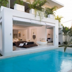这栋别墅位于印度尼西亚巴厘岛,共有两层,创造性地利用有限的空间,不同功能的区域完美融合在一起,例如,餐厅也可作为休息室,客厅与泳池相连,每间卧室都可以当做休闲区。设计师还按客户要求严格限制了别墅色调,别墅内白色墙壁、抛光混凝土和白色木材与自然植被的色调相结合。室内家具是从世界各地收集来的,以一种新鲜的搭配将别墅内装饰得新颖别致。