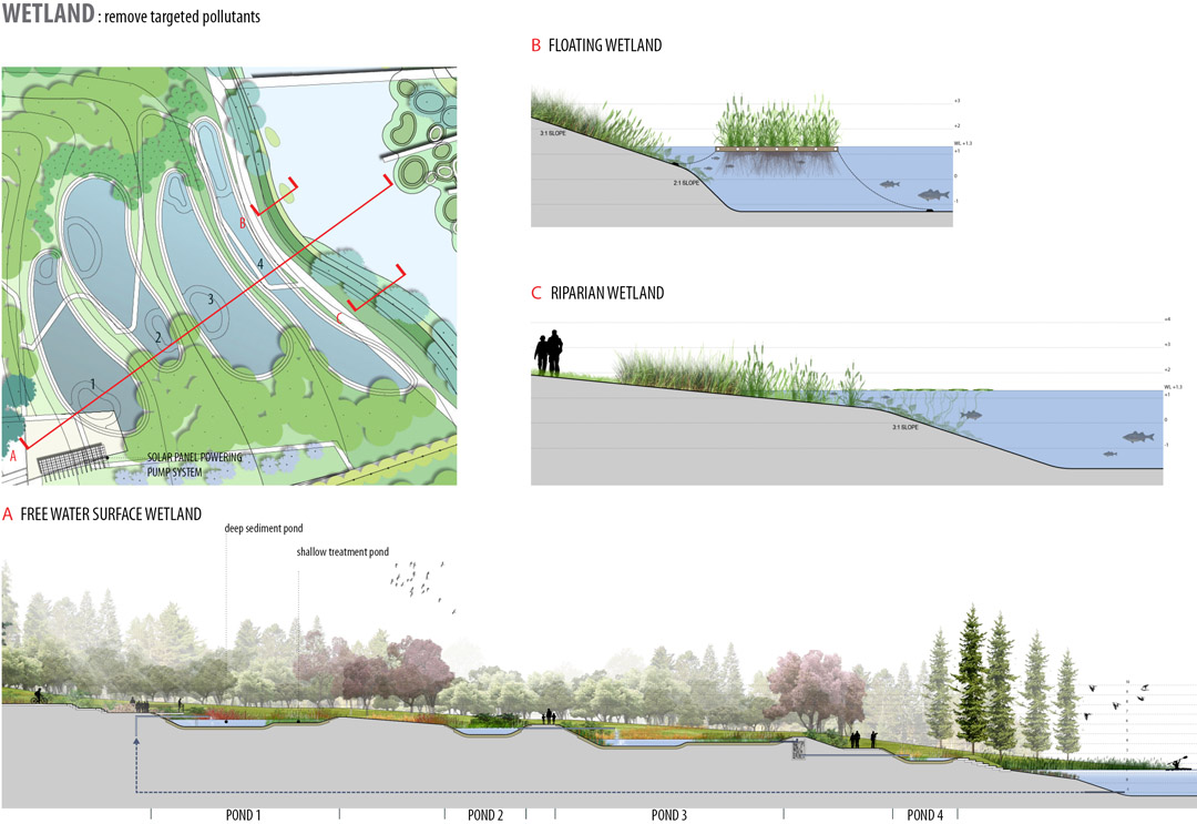 ↑ 通过与水质学家合作,设计师通过使用主动和被动充气方法,促进地下水流穿过植物根系去除污染物。