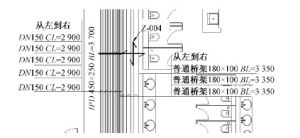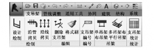 图3支吊架基于Revit的绘制插件(1)管线综合协调过程中还应根据实际情况综合布置。避让原则:有压管让无压管,小管让大管,施工容易的避让施工难度大的。 (2)支吊架节点图最终出图时,剖面图、平面图所表现的位置、标高应保持一致,需要充分考虑管线周围的梁、柱、墙等构筑物并详细展示在节点图中。标高时,一般有压管标管中,排水管标管底,风管、桥架都标管底。在管线综合布排过程中,平面图与剖面图调整应同步。 (3)支吊架应考虑到空调水管、空调风管保温层的厚度,考虑与电气桥架、水管外壁、墙柱的最小净距,考虑支吊架垂直槽钢的放置空间。根据现场实际情况确定各管线间的距离。抗震支吊架还应考虑斜撑形式与斜撑放置空间,这也是抗震支吊架设计安装中的难点。 (4)空调冷、热水管布置时应考虑管道坡度,考虑设备、管路的操作空间及检修空间。水管与桥架的空间位置还应考虑平行净距与交叉净距。 (5)对支吊架周围的建筑结构,因为其作为支吊架的生根点,直接决定支吊架是否牢靠,必须有清晰的了解,特别是板厚,再选用适当的锚固方式与锚栓。 具体的实施方式有以下几种: (1)用BIM技术对走廊管线进行三维建模,根据三维模型生成剖面图;生成剖面图时,自动附着、捕捉系统中的管道截面及标高。 (2)根据空间要求及不能调节的管线(譬如排水管线),必要时可更改有压管走向(在剖面中上下左右调节位置),风管形状规格(譬如800×750可改为1000×600,这样可节约吊顶空间);强电还需考虑放置电缆空间与检修空间,根据现场情况,必要时可以把桥架分改为几根线管综合布排,以节约相应的空间。 (3)更改完剖面图后通过BIM技术对更改后的各专业管线再次碰撞检查,检查各管线是否与建筑结构碰撞,各专业间是否碰撞,进行再次协调整合,如此往复多次。最后生成的平面图中管线走向同步作了相应的改变。 2.2BIM技术在抗震支吊架系统的应用实例 2.2.1系统设计与模拟 该项目为广州某大型项目,选择管线设备集中的地下二层核心筒走廊样板区进行成品与抗震支吊架的深化设计。 走廊层样板区位于地下二层南北走向走廊,该区域管线较多。其包含了冷却水、消防喷淋、给水、送排风、变配电及应急电源、照明、弱电控制等多个系统的管线。该区域管线复杂,而且还需要保证抗震斜撑的安装空间,从而需要更准确的管线综合排布。BIM效果图更能体现管线的布排及支吊架各个构件所需要的位置空间。最具代表性的支吊架模拟就是同时双侧向及双纵向的门型抗震支吊架的模拟。 技术人员首先对该区域的设计图纸进行了图纸会审,根据设计的二维图纸中的管线位置进行模拟,判断是否有空间位置安装能承受相应地震力荷载的支吊架,如不能,将标注有出入处和需要更改空间位置的管线进行整理并与设计沟通。然后对该区域管线进行管线综合布排并进行模拟设计、绘制管线图,最后对综合后的管线进行碰撞检测。图4为走廊样板区二维设计的局部平面图,图5为管线剖面图,图6为走廊样板区门型抗震支吊架的三维效果图。 图4走廊样板区二维设计的局部平面